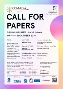 Dear All,The 5th INTERNATIONAL CONFERENCE ON NEW MEDIA STUDIES (CONMEDIA 2019) will be organized by Universitas Multimedia Nusantara (UMN). The conference will be held in Bali, Indonesia on October 9 – 11, 2019. Full papers submissions due July 7 2019. All presented papers will be submitted for inclusion in:• IEEE Xplore Digital Library• International Journal of Asia Digital Art and Design• International Journal of New Media Technology